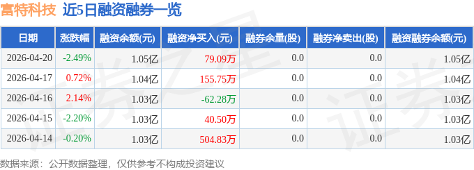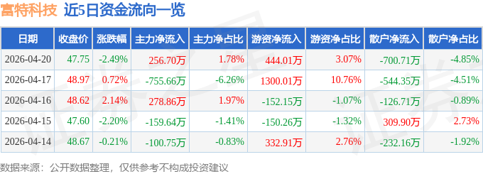 证券之星音讯,到2026年4月20日收盘,富特科技(301607)报收于47.75元,跌落2.49%,换手率2.7%,成交量3.02万手,成交额1.44亿元。